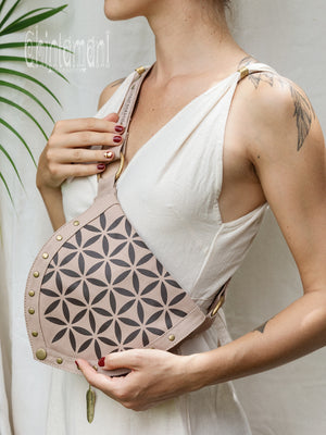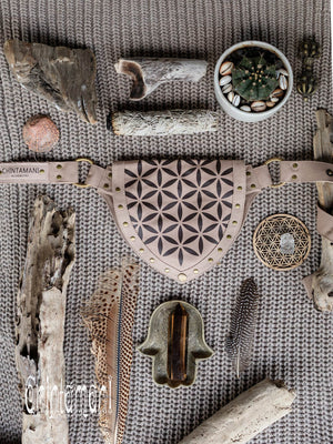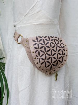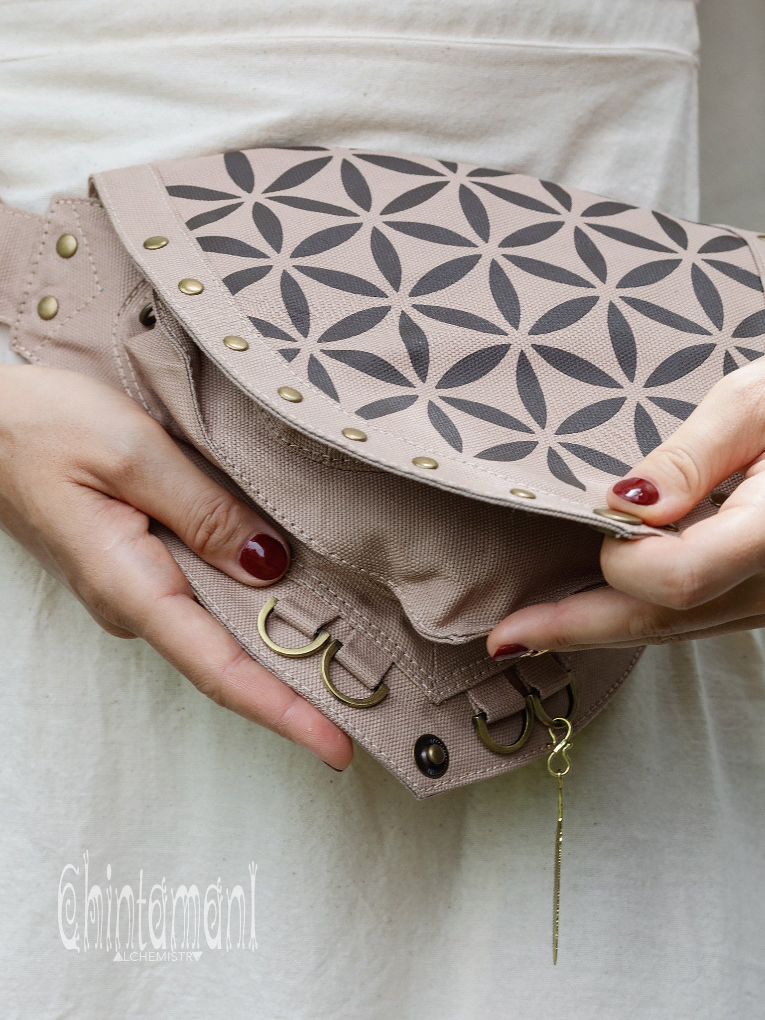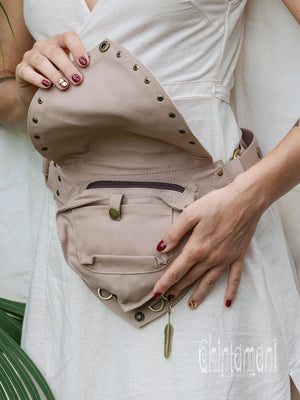 Chintamani Alchemistry Pocket Belt Bag is a very special original accessory, that we created long before the recent fashion rebirth of the pouches. Our Canvas Hip Bag unique “droplet” silhouette compliments skirts or dresses and looks more like a belt, than like a baggy fanny pack. To highlight its special design, the bag is decorated with brass rivets on the edge. The piece is very versatile - it can be worn across the body, with its adjustable snap buttoned belt, becoming a decorative stripe, that compliments and shapes floaty boho kimonos and tunics. The main pocket of the Waist Bag is big enough for the phone and small cosmetic necessities, while there are two extra pockets for valuables. Beautiful brass rings on the belt can be used to lock key carabiner or water bottle. Decorated with solid brass original feather. This thigh bag is available in various colors of our natural soft palette and with Flower of Life sacred print. This amazing artifact from Chintamani Alchemistry is a true fashion statement, suitable not only for festivals, but for your normal city life as well.