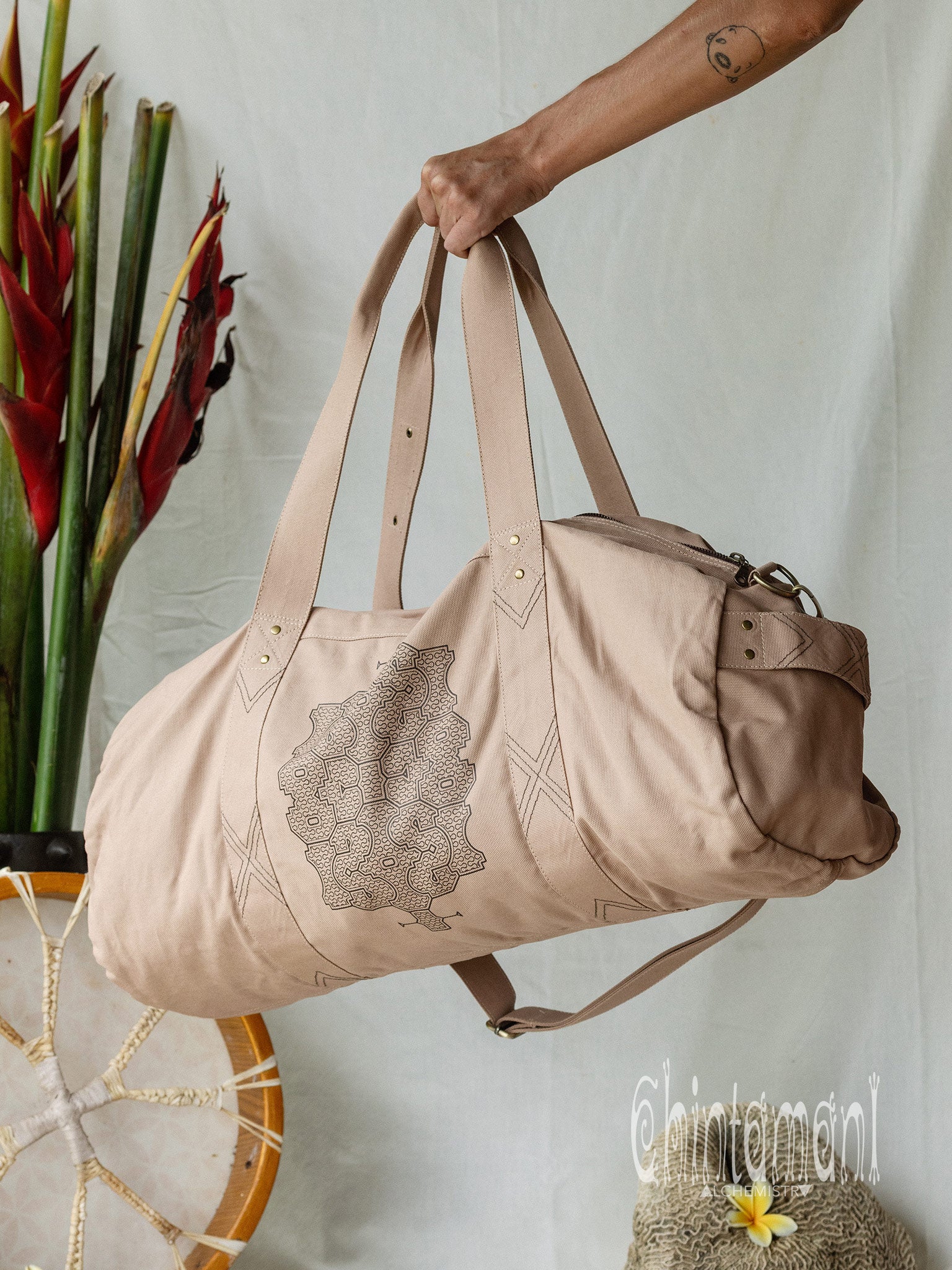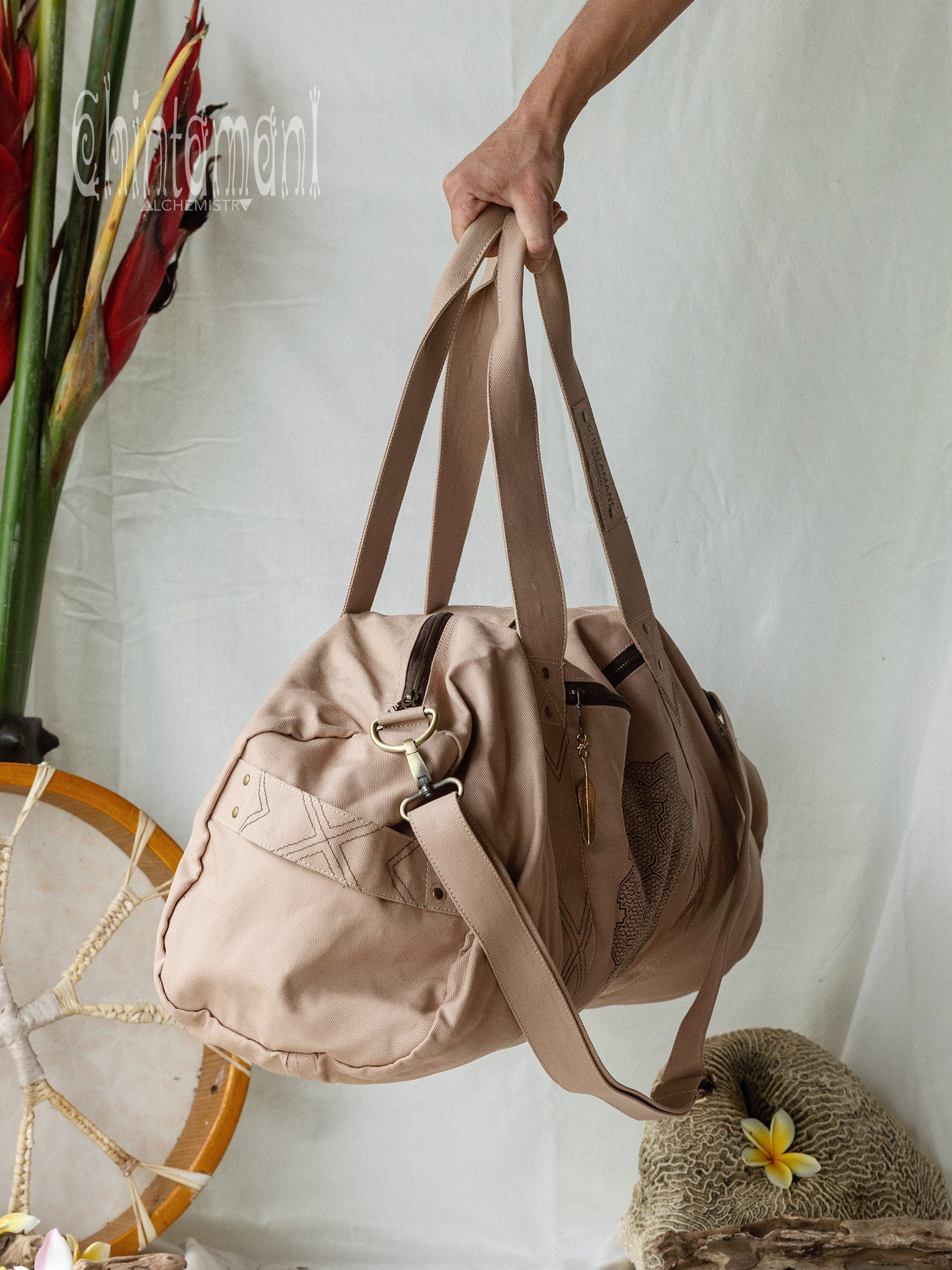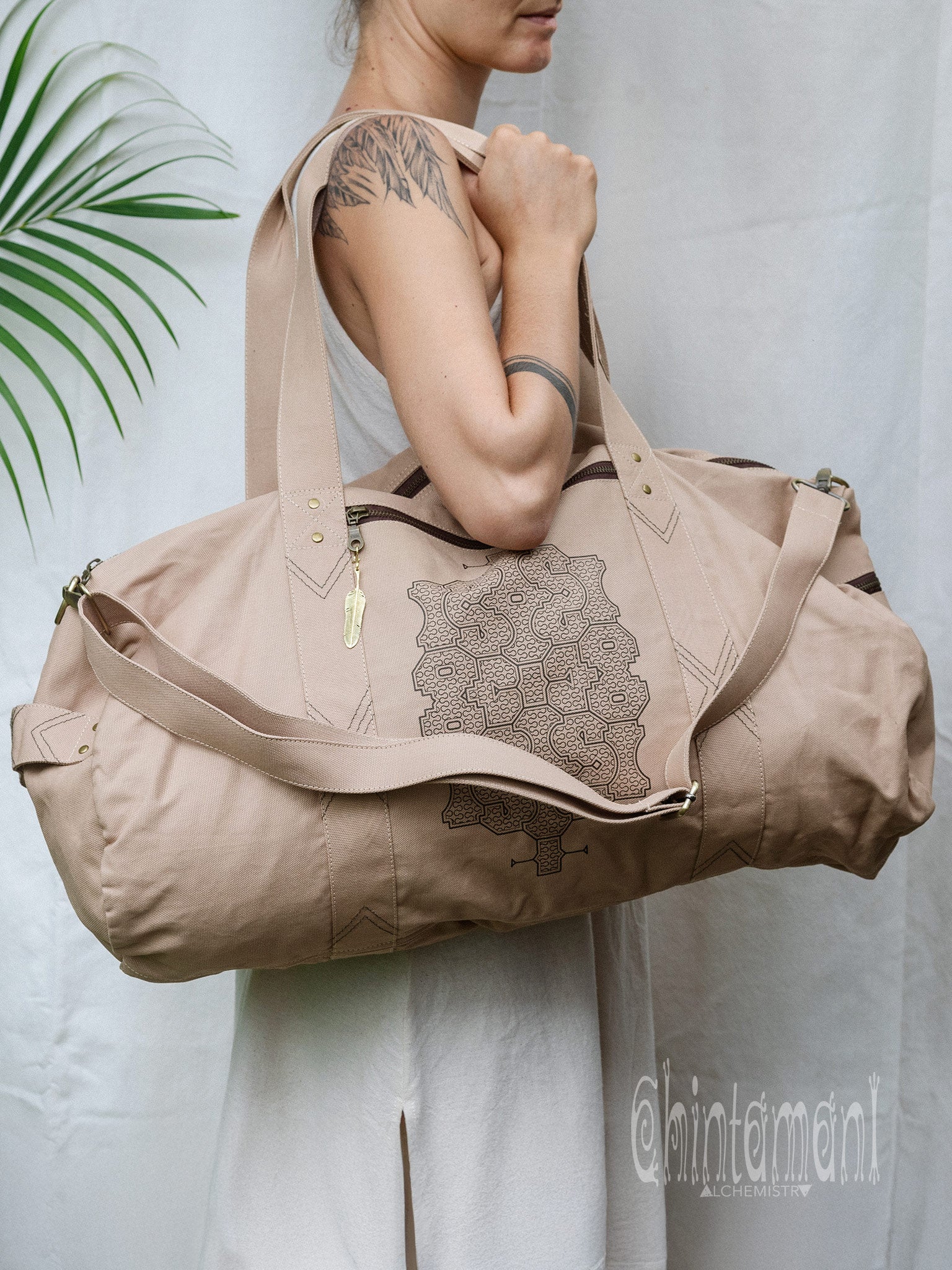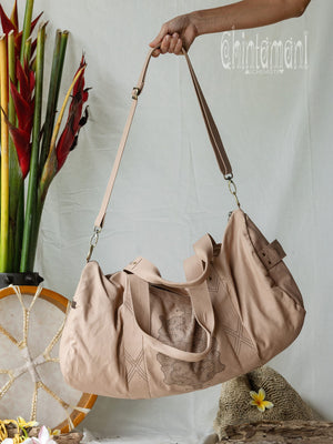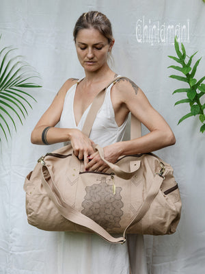 Beautiful Chintamani Alchemistry Large Duffle Bag is made for traveling in style. It is quite spacious, and can contain everything necessary for a short trip, while still being qualified as hand baggage. Also, it is very handy for carrying around your sport and practice equipment – for instance, yoga mat fits inside perfectly! This soft stylish bag is decorated with sacred Shipibo Conibo patterns and geometric tribal stitching. The zipped pocket in front has a little complimentary Feather Pendant – our signature symbol of Lightness and Freedom. Just exactly what this bag was made for!