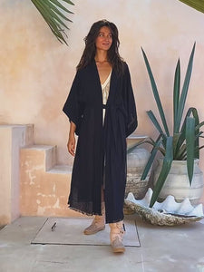 Raw Cotton Printed Kimono is our new simple, elegant, very classy and sleek creation. It is a gorgeous bohemian artefact that you can throw on over any simple dress, jumpsuit or pants with top to have a glamourous evening gown. Nothing too much, just very basic silhouette and primitive geometric print on the back, but the beautiful raw cotton fabric itself and little designer twists here and there make this piece truly unique. Side slits and 3\4 wide sleeves create very airy feeling to the Kimono. It comes in our signature pale amazing colors – dusty pink, off white, red ochre, sage and black.