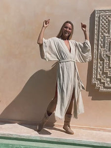 Raw Cotton Printed Kimono is our new simple, elegant, very classy and sleek creation. It is a gorgeous bohemian artefact that you can throw on over any simple dress, jumpsuit or pants with top to have a glamourous evening gown. Nothing too much, just very basic silhouette and primitive geometric print on the back, but the beautiful raw cotton fabric itself and little designer twists here and there make this piece truly unique. Side slits and 3\4 wide sleeves create very airy feeling to the Kimono. It comes in our signature pale amazing colors – dusty pink, off white, red ochre, sage and black.