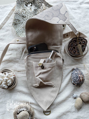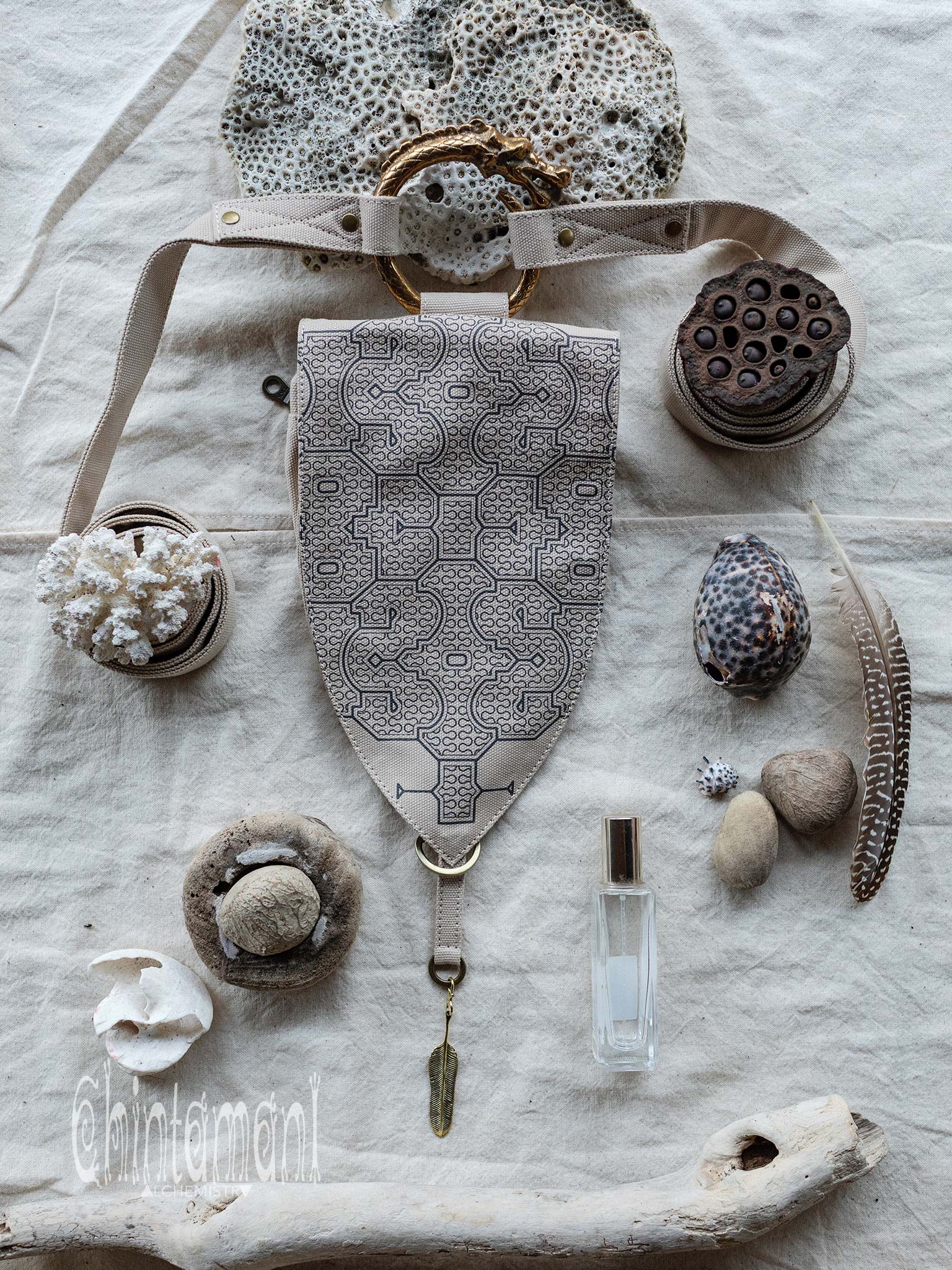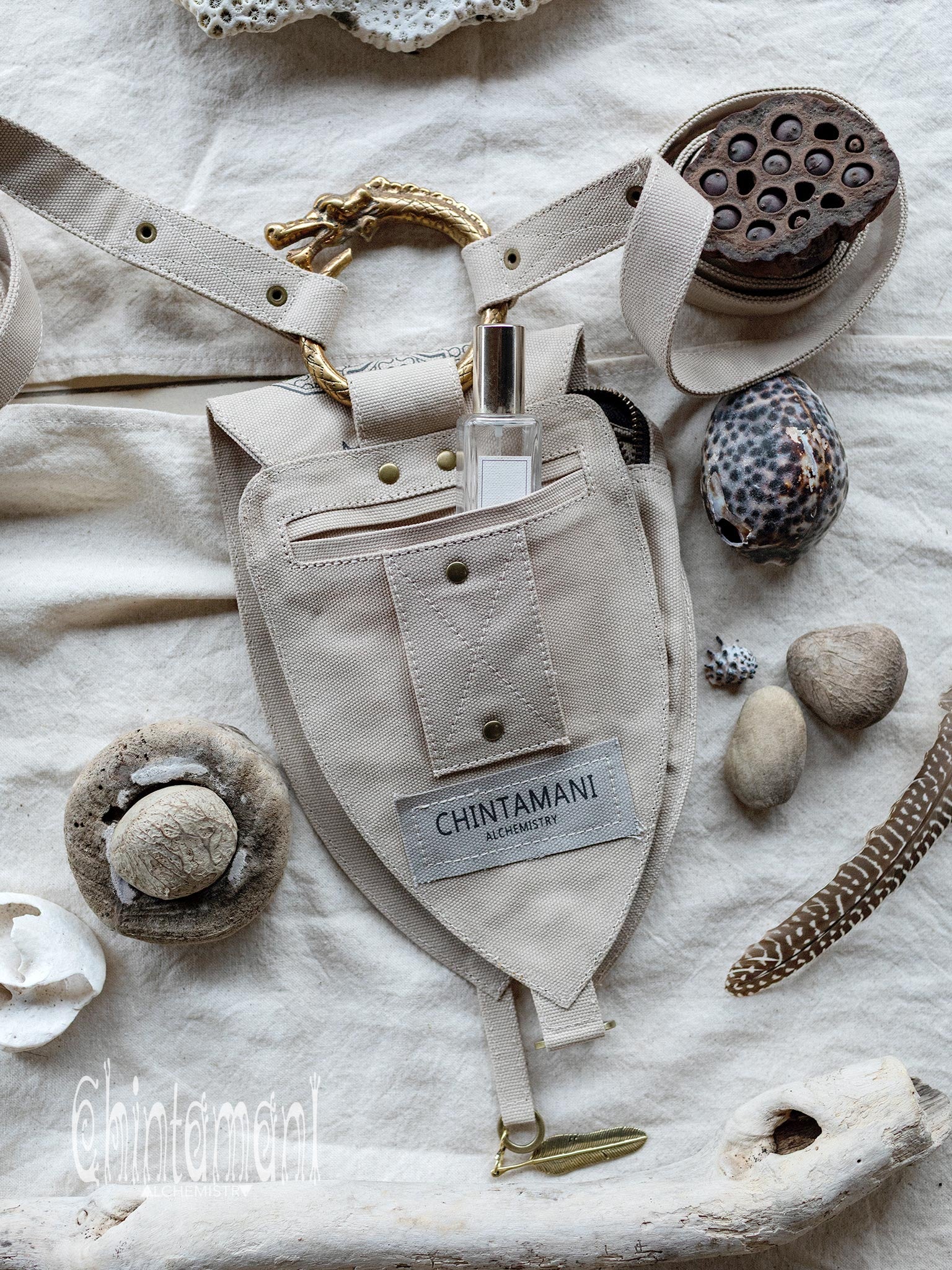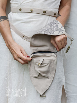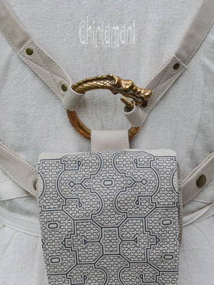 Big Dragon Transformer Unisex Holster Bag / Waist Thigh Bag is a gorgeous artefact of our unique design. It is amazingly flexible – it can be a Lara Croft holster bag or a little fairy backpack - you can transform its long belt with snap buttons in so many creative ways! Furthermore, you can choose your special color, it is available in 4 various shades: black, grey, beige and off-white. The droplet shape of this elaborate creation is reminiscent of medieval shields and coats of arms, big brass ouroboros ring is beautifully oriental and Shipibo screen print was inspired by art of Amazon rain forest tribes. All these many symbols are merged together in a very subtle, true Chintamani Alchemistry way – to create something that looks like an art object, but is quite useful! You can easily put your phone, money and other necessities into one main zipped compartment and two smaller secure pockets of this bag. As all our artifacts, this one is decorated by protective amulet – Chintamani Alchemistry brass feather pendant, handmade in our Bali jewelry workshop!