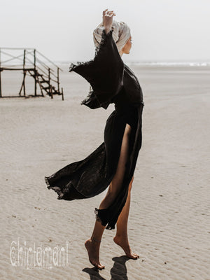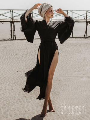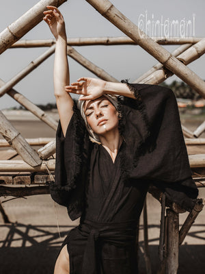 Unique precious gem from our limited collection, this Japanese inspired black linen kimono robe is an exotic, but very comfortable gown, made in luxurious pure silk or noble 100% linen. This is our newest creation, that required all Chintamani Alchemistry experience in tailoring and fabric research, in order to create a real masterpiece, laconic and perfect. It can be worn as a classic kimono, or as a gorgeous bohemian mantle on top of our linen or silk dresses. You can also tie the front folds of the piece, to create a stunningly flowing wrap top. An exquisite boudoir piece to spoil all your senses, this long kimono cardigan comes with a massive 2,5 meter linen belt, that shapes its Japanese silhouette.