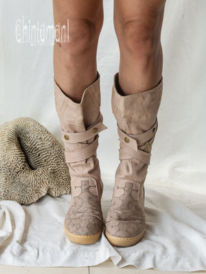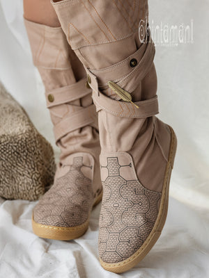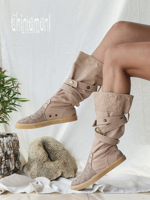 Full Vegan bohemian high shoes made of 100% cotton canvas. These elegant canvas high boots will suit a traveler, a dreamer or a city dweller, who likes natural feel and comfort. They complement any leg shape and can be worn either with pants, skirts or dresses. Wearing stunning Chintamani Alchemistry shoes, one doesn't have to compromise between amazing boho chic look and ability to walk for miles and dance for hours. Flat, comfortable sole is stitched all around so it will last for years of continuous use. Solid Brass Chintamani feather buckle go together with each pair.