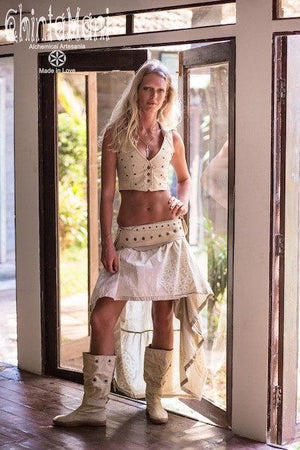 Our famous Transformer Long Boho Skirt is a long time Chintamani Alchemistry favourite. Made out of soft cotton satin this garment is a beautiful addition to your summer wardrobe. The main feature of this bohemian skirt are two snap buttons on the front, that can be used for rising the hemline, creating gorgeous asymmetric cascade. When unbuttoned, the garment transforms into graceful floor long gypsy skirt with flower of life sacred geometry pattern, screen printed by hand. This organic skirt is supposed to be worn low at hip level, it looks amazing with crop tops. Chintamani Alchemistry belt bags will finish off the look, accenting the beautiful flow. There is an option of wearing Transformer Skirt underneath our raw cotton and linen dresses, which create multilayer stunning vintage outfit. Solid brass feather is going in set.