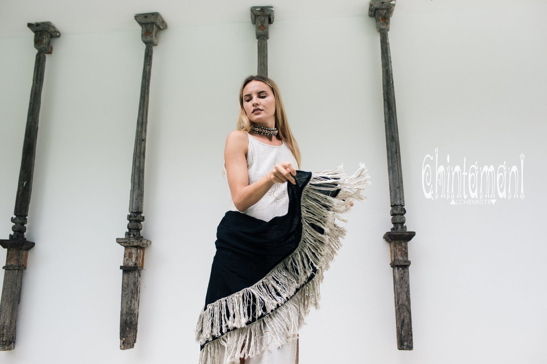 Ultimately bohemian Alma Libra Fringe Shawl is a beautiful accessory for chilly evenings. It is made of soft raw cotton and decorated with two rows of the signature Alma Libra collection linen fringe, so long, fluffy and unique. This wrap boho shawl is quite easy to style – just through it around you neck, and the boho chic look is ready. But if you take a little more time and effort, it can also become a gorgeous turban – a real oriental princess crown! Natural 100% pure cotton makes this scarf very light and pleasant to wear even in hot weather. We make them in shiny cream-white or classy black color, the second option is unisex – so that you can get one for you and your partner as well. This little artifact is so much us – light, feathery, soft and original!