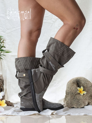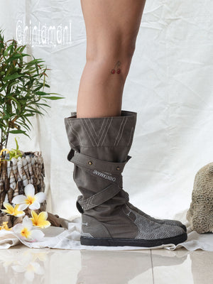 Full Vegan bohemian high shoes made of 100% cotton canvas. These elegant canvas high boots will suit a traveler, a dreamer or a city dweller, who likes natural feel and comfort. They complement any leg shape and can be worn either with pants, skirts or dresses. Wearing stunning Chintamani Alchemistry shoes, one doesn't have to compromise between amazing boho chic look and ability to walk for miles and dance for hours. Flat, comfortable sole is stitched all around so it will last for years of continuous use. Solid Brass Chintamani feather buckle go together with each pair.