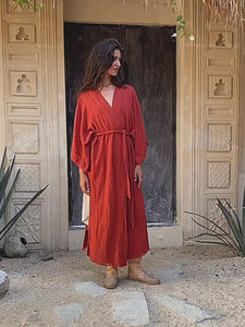 Raw Cotton Printed Kimono is our new simple, elegant, very classy and sleek creation. It is a gorgeous bohemian artefact that you can throw on over any simple dress, jumpsuit or pants with top to have a glamourous evening gown. Nothing too much, just very basic silhouette and primitive geometric print on the back, but the beautiful raw cotton fabric itself and little designer twists here and there make this piece truly unique. Side slits and 3\4 wide sleeves create very airy feeling to the Kimono. It comes in our signature pale amazing colors – dusty pink, off white, red ochre, sage and black.