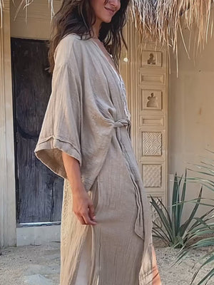 Raw Cotton Printed Kimono is our new simple, elegant, very classy and sleek creation. It is a gorgeous bohemian artefact that you can throw on over any simple dress, jumpsuit or pants with top to have a glamourous evening gown. Nothing too much, just very basic silhouette and primitive geometric print on the back, but the beautiful raw cotton fabric itself and little designer twists here and there make this piece truly unique. Side slits and 3\4 wide sleeves create very airy feeling to the Kimono. It comes in our signature pale amazing colors – dusty pink, off white, red ochre, sage and black.