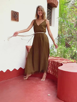 Long and gorgeous V-neck dress made of pure cotton – is a perfect base for boho layered look, or a classy outfit by itself. Natural cotton is very pleasant to wear. Long strait silhouette with subtle side slits is very simple and noble. Decorative fringe and macramé belt add the designer accent to the piece. It comes in our statement off white gentle color, but also in powerful red, black and earthly brown. It can be an evening dress, a festival outfit or just a favorite light summer seaside garment.